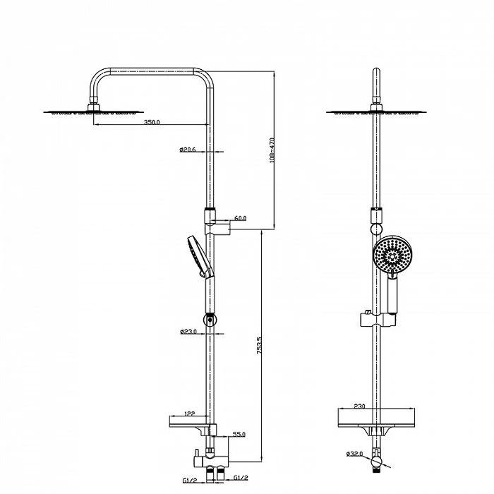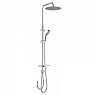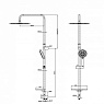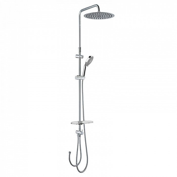 Душевой гарнитур с верхней лейкой. Ручная лейка с 5 режимами (Rain, Massage, Rain&Massage, Hard Massage, Rain&Hard Massage). Стойка: нержавеющая сталь. Верхняя лейка: нержавеющая сталь, сверхтонкая, диаметр 300 мм. Ручная лейка: ABS-пластик, диаметр 118 мм. Шланги: нержавеющая сталь, 1,5 и 0,6 метра, с системами Double Lock и Twist-Free. Поворотный керамический дивертор: три режима (переключалель верхний душ/ручная лейка/комбо-режим). Верхнее крепление стойки свободное. Телескопическая стойка, высота 860-1223 мм. Шарнирное крепление верхней лейки регулирует направление потока под нужным углом. В комплекте: вместительная полка из высокопрочного ABS-пластика, крепеж.