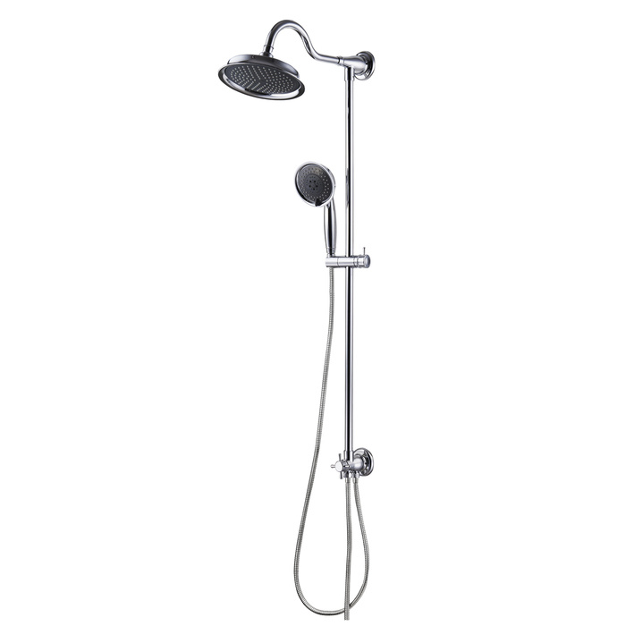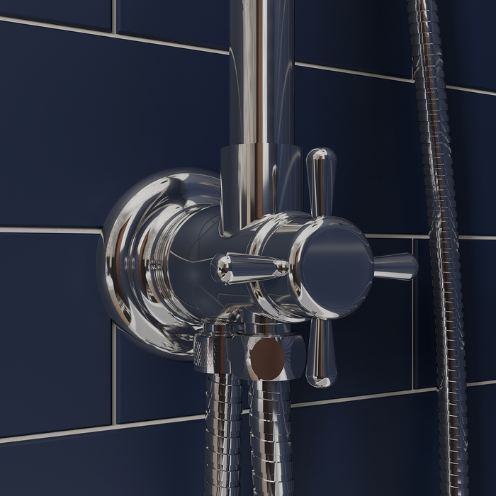 Душевой гарнитур Retro с высокой (1200 мм) стойкой – это классическая форма и современная эстетика, которые помогут сделать винтажный интерьер более изысканным. Поворотный керамический дивертор работает при любом давлении воды, переключая поток воды на верхнюю душевую лейку (диаметр – 220 мм), многорежимную ручную лейку (4 режима) или в комбинированном режиме.