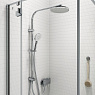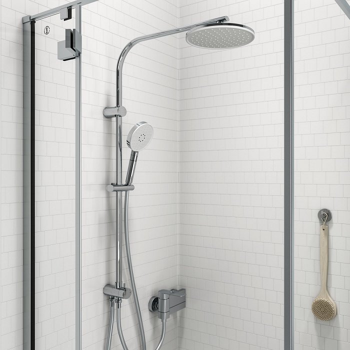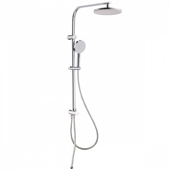 Душевой гарнитур с верхней лейкой. Стойка из нержавеющей стали с никель-хромовым покрытием, высота стойки 970 мм. Материал корпуса дивертора - ABS-пластик.