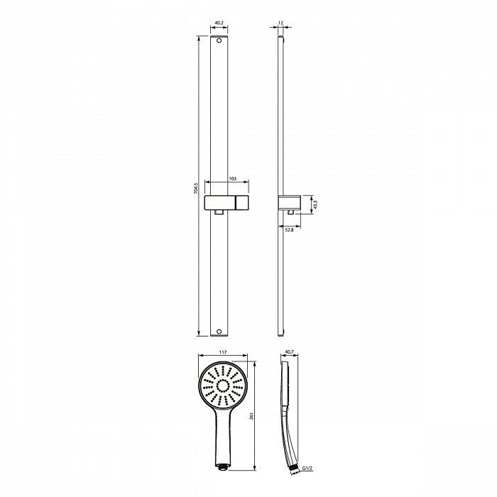 Особенность - плотное прилегание стойки к стене, крепления скрыты, держатель скользит по внешней поверхности стойки. Поверхность у всех элементов матовая.