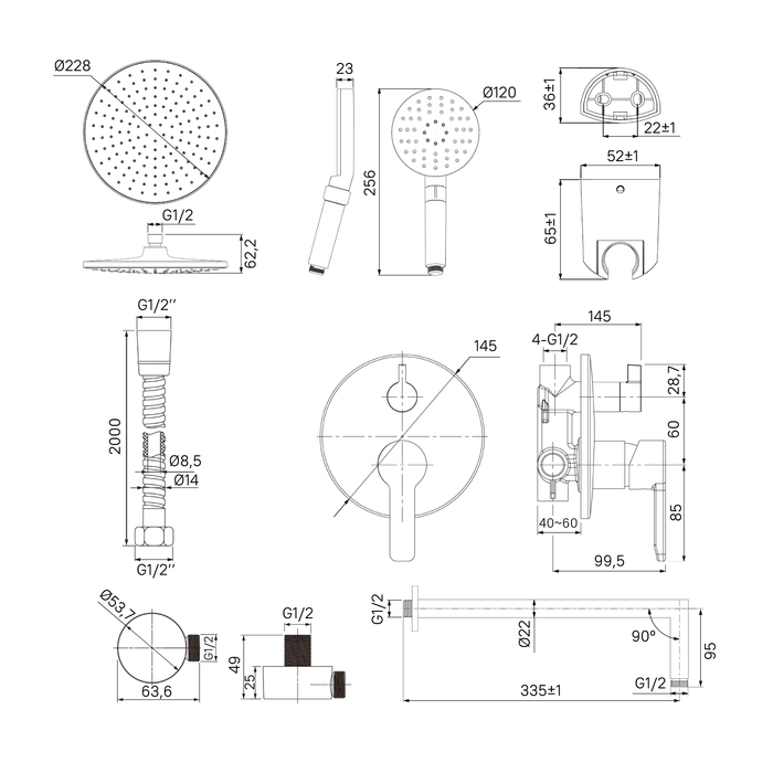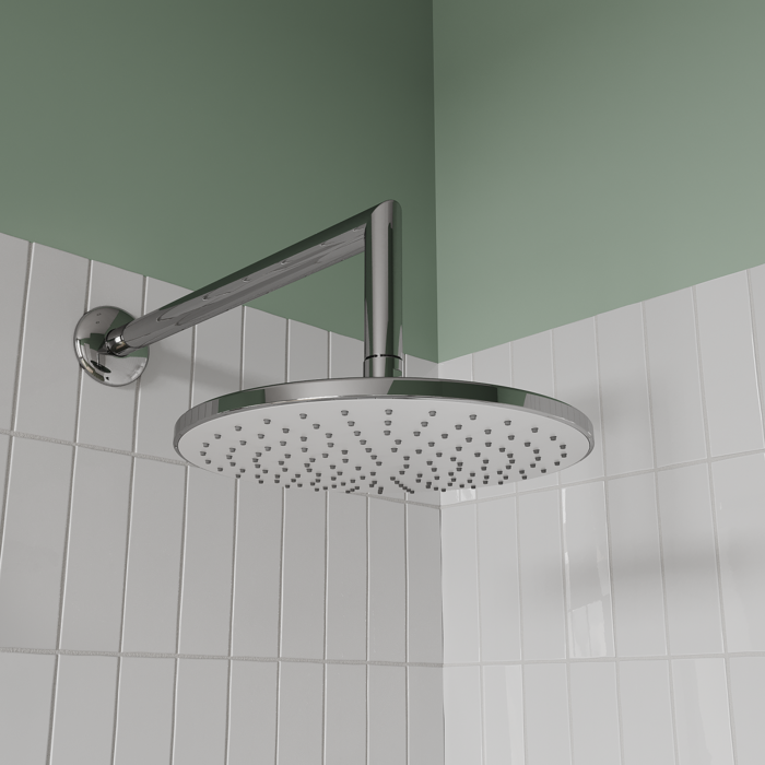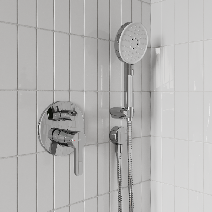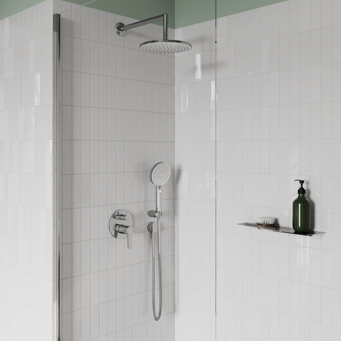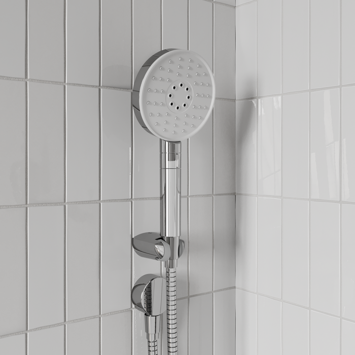 Оптимальная подборка от IDDIS®: смеситель, круглая лейка для тропического душа с кронштейном, ручная лейка с 3 режимами и держателем, душевой шланг 2 м, выход для шланга.