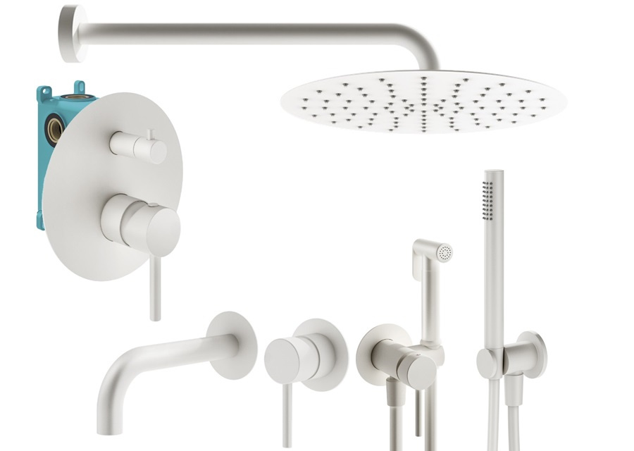 Состав комплекта:KITXO1135BO210 Комплект встраиваемого смесителя для раковины, излив 210мм, накладка диам. 70мм, внутренняя часть INT1135 в комплекте, белый матовый IXO, Plumberia SelectionXO2000BO Комплект гигиенического душа IXO со смесителем, душ и держатель из металла, шланг PVC 1250мм, белый матовый IXO, Plumberia SelectionKIT1901BO Комплект встраиваемого смесителя для душа с внутренней частью INT9036 на 2-3 выхода, накладка d. 170mm нержавеющая сталь, механический девиатор, белый матовый IXO, Plumberia SelectionHST3018BO Комплект ручного душа, водорозетка с запорным клапаном и держателем, душ латунь 1 режим антикальц., шланг PVC 1500мм, белый матовый, Plumberia SelectionSAT3130BO Настенное крепление верхнего душа 400мм из нержавеющей стали, белый матовый, Plumberia SelectionSAT3174BO Верхний душ d. 250 из нержавеющей стали, встроенный клапан безопасности, поворотное крепление, антикальций, 2мм, белый матовый, Plumberia Se