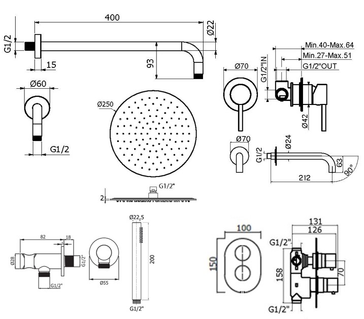 KITXO1135CR210 Комплект встраиваемого смесителя для раковины, излив 210мм, накладка диам. 70мм, внутренняя часть INT1135 в комплекте, хром IXO, Plumberia Sel XOT5040CR Смеситель термостат встраиваемый для душа 2 выход в комлекте со встраиваемой частью, накладка овальная из нержавеющей стали, хром, Plumberia Selection