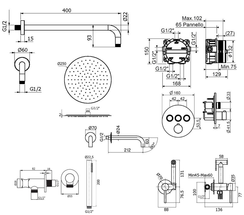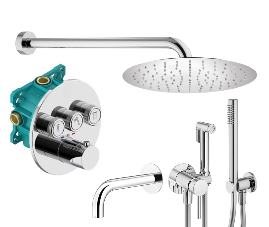 KITPSB1903CR Комплект встраиваемого термостатического смесителя для душа, 3 выхода с внутренней частью PSB003, кнопочное переключение с регулировкой расхода, накладка нержавеющая сталь d. 160 HST3018CR Комплект ручного душа, водорозетка с запорным клапаном и держателем, душ латунь 1 режим антикальц., шланг PVC 1500мм, хром, Plumberia Selection