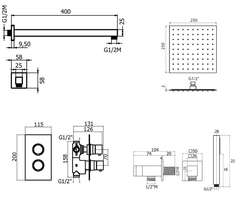 SAQ3114NO Верхний душ 250X250 из нержавеющей стали, встроенный клапан безопасности, поворотное крепление, антикальций, 2мм, черный матовый, Plumberia Selection.