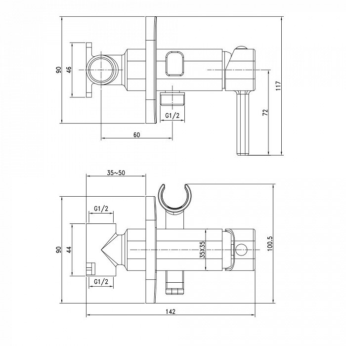 Встраиваемый смеситель с гигиеническим душем и крючком для полотенца, квадратный, однозахватный, латунь, керамический картридж Softap. В комплекте: шланг 1.2м, гигиеническая лейка ABS-пластик. Упаковка: картонная коробка, индивид мешок.