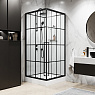 Профиль алюминиевый черный матовый. Остекление: закаленное стекло. Лицевые стела прозрачные 5 мм с рисунком клетка. Задние стенки белые крашенные 4 мм. Поддон низкий (15 см, глубина 2-4 см) усиленный, выдерживает нагрузку до 350 кг. Слив в углу, диаметр 5 см. Бессиликоновая сборка за счет дренажных каналов и бортиков. Вода не скапливается, что исключает образование плесени и грибков.