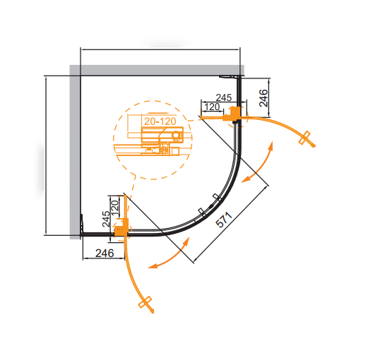 конструкция петли позволяет регулировать ширину входа душевого ограждения в диапазоне 10 см.
