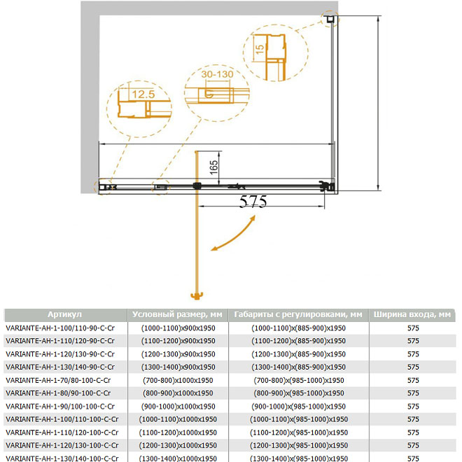 конструкция петли позволяет регулировать ширину входа душевого ограждения в диапазоне 10 см.