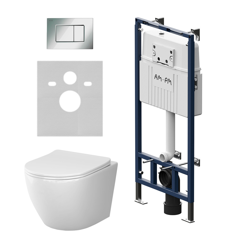 Полностью готовый к установке комплект: система инсталляции с клавишей подвесной унитаз с сиденьем включающий все необходимые крепления патрубки звукоизолирующую прокладку. Экономия пространства благодаря узкому бачку – 120 мм глубиной. Заливной клапан с низким уровнем шума - Класс II согласно европейского стандарта EN 14124.